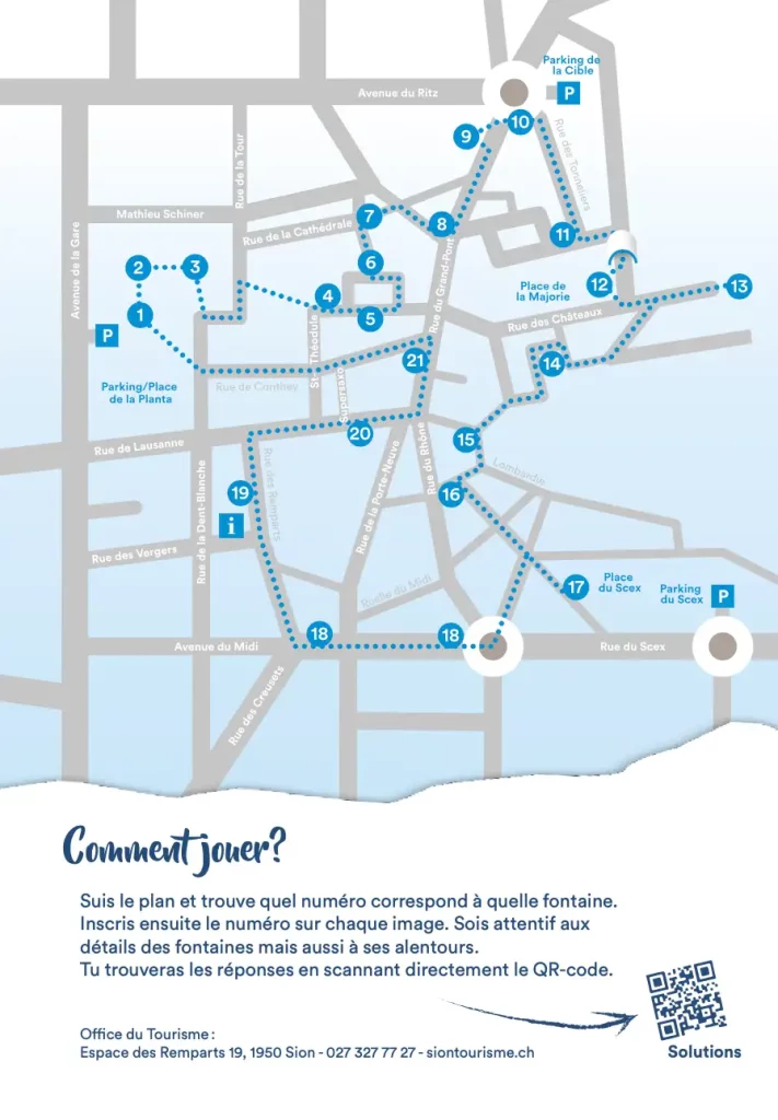 L’office du tourisme de Sion a mis en place une activité ludique et culturelle à vivre en famille. Une chasse aux trésors pour retrouver une vingtaine de fontaines disséminées en vieille ville de Sion. Une balade urbaine d’environ 2 heures et accessible à tous.