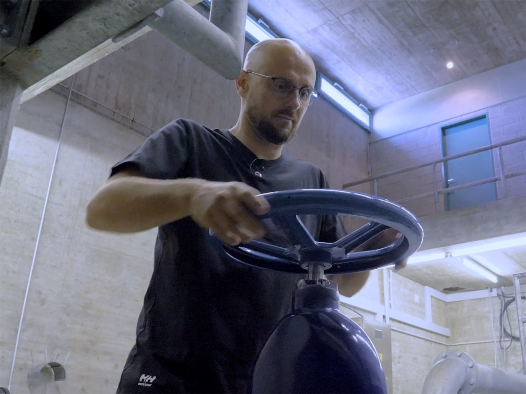 La journée de Yann Antille débute dans la salle de contrôle du réseau d’eau. Grâce à un système informatique de télégestion performant, il peut vérifier en temps réel le bon fonctionnement des différentes installations. Par exemple, l’observation du débit et de la consommation d’eau d’un réservoir peut l’alerter au sujet d’une fuite ou d’un problème technique. Mais le contrôle à distance ne représente qu’une partie du travail du fontainier. L’essentiel se passe sur le terrain, dans les différents points névralgiques du réseau: autour des sources en montagne ou des puits de pompage en plaine, et auprès des installations de captage et de stockage.