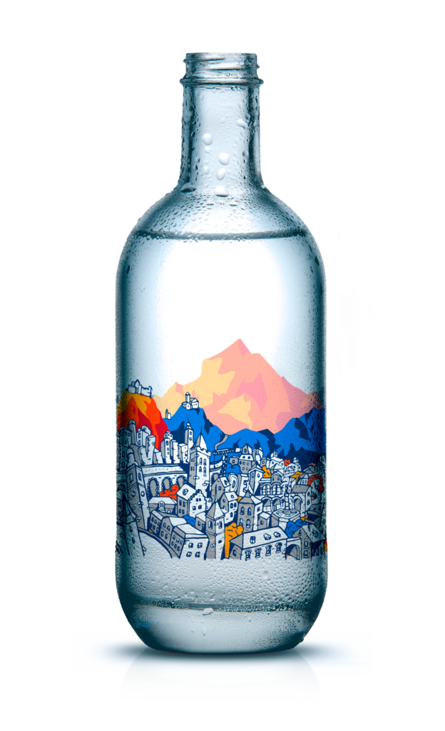 L’œuvre réalisée pour la carafe et reproduite sur le mur des cinémas de Sion illustre une ville en mouvement au cœur des Alpes et des enjeux environnementaux. Intitulé « A flow to the Valley », le visuel du duo lauréat présente la liaison entre un environnement montagneux dominant et une plaine urbanisée en mouvement. « Le fait que près de 80% de l’eau de Sion provienne de sources situées sur les coteaux nous a donné l’idée de traduire visuellement ce flux d’énergie, allant des sommets intacts jusqu’à la ville. Les couleurs vives des montagnes mettent l’accent sur la puissance de la nature ainsi que sur l’abondance et la proximité de l’eau de source. Le bleu et l’orange soulignent subtilement la variation des températures et des saisons alors que le monochrome de la ville nous replace face au questionnement de la densification et de l’utilisation du béton. »